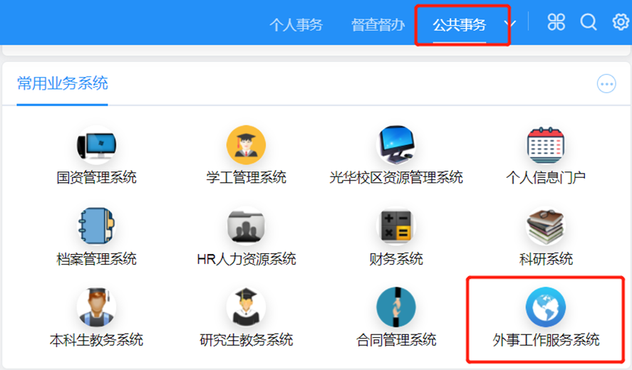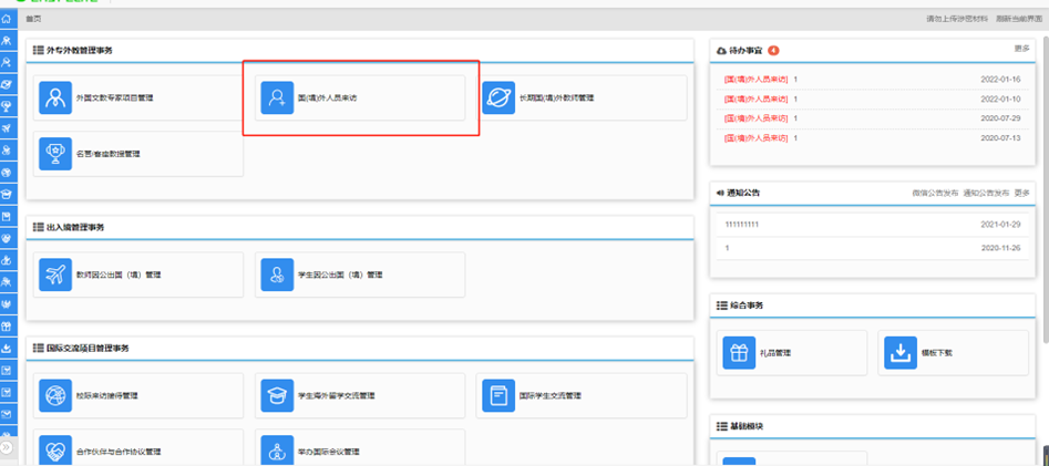 外事工作服务系统(网址:http://10.8.78.131)已与学校OA系统实现统一认证对接,教职工可使用个人账号密码登录统一认证,在公共事务栏的常用业务系统里点击外事工作服务系统模块,系统自动跳转外事工作服务系统,而不需要单独注册。在系统首页,选择国(境)外人员来访,如下图: