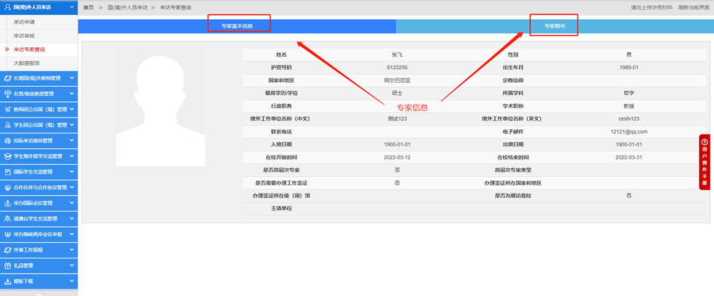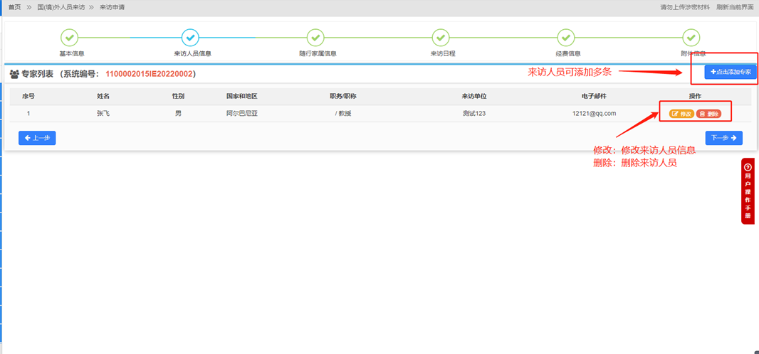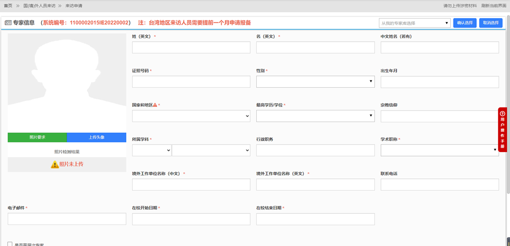 来访人员信息页面,点击右上角的“点击添加专家”进入专家信息页面,标有红色星号的为必填项。