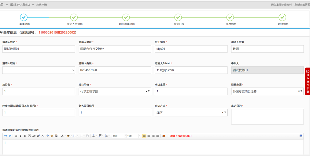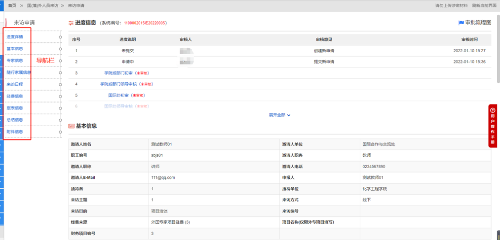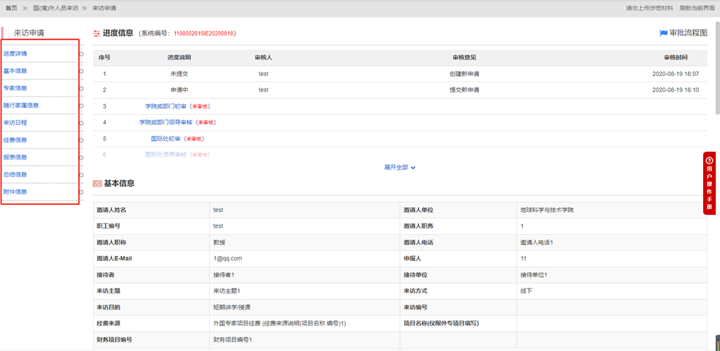 通过操作下的【来访查看】进入申请详情页面,此页面包括进度详情、基本信息、专家信息、随行家属信息、来访日程、经费信息、报表信息、附件信息,点击左侧导航栏即可快速定位到具体数据处,如下图: