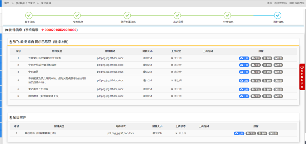 附件信息页面,附件分为专家附件与项目附件,需要上传外专护照/证件复印件、专家简历等。