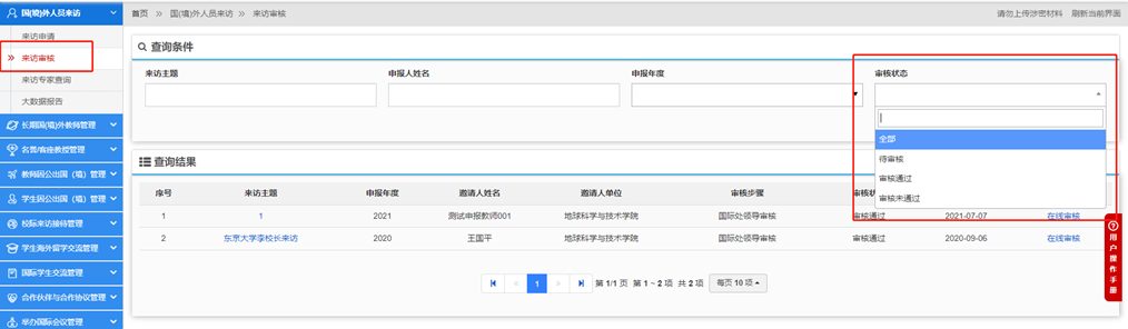 负责审核的老师或领导登录系统后,进入国(境)外人员来访模块,点击来访审核,系统默认显示待审核申请,如要查看所有待审和已审记录,将查询条件中的审核状态的选项删除或选择全部然后再搜索一下;