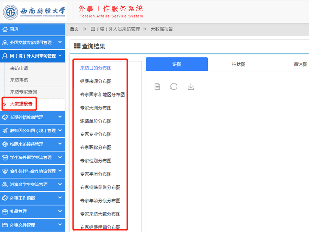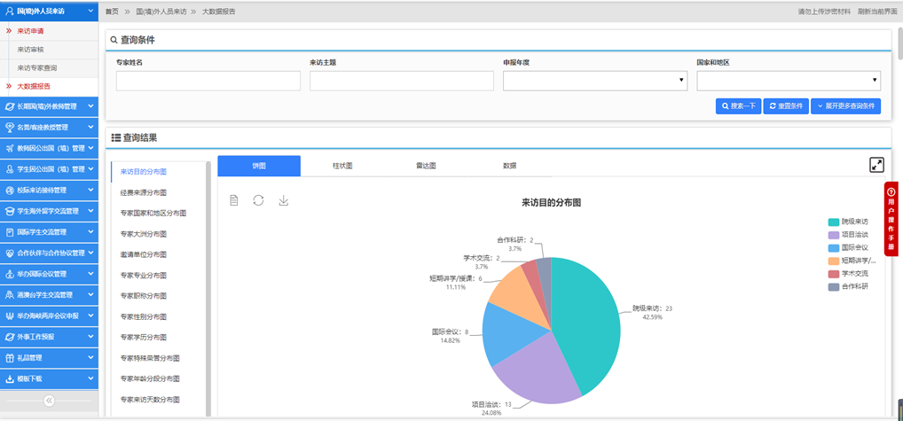 管理员功能,系统以图表形式显示查询结果,常用的统计数据包括出访目的分布图、经费来源分布图、专家国家和地区分布图、专家大洲分布图、邀请单位分布图、专家专业分布图、专家职称分布图、专家学历分布图、专家来访天数分布图、申请状态分布图、申请单位年度分布图等。