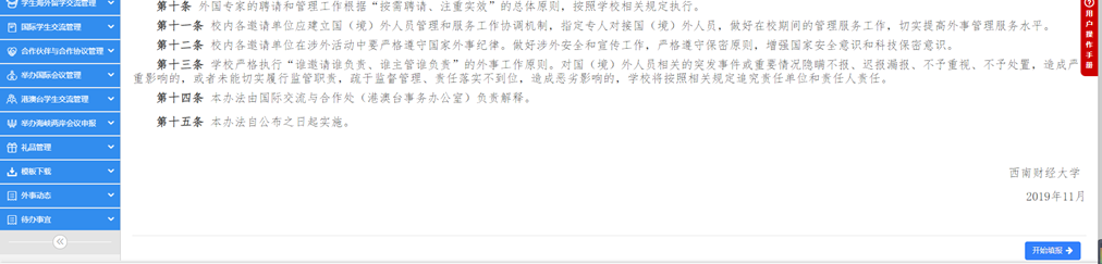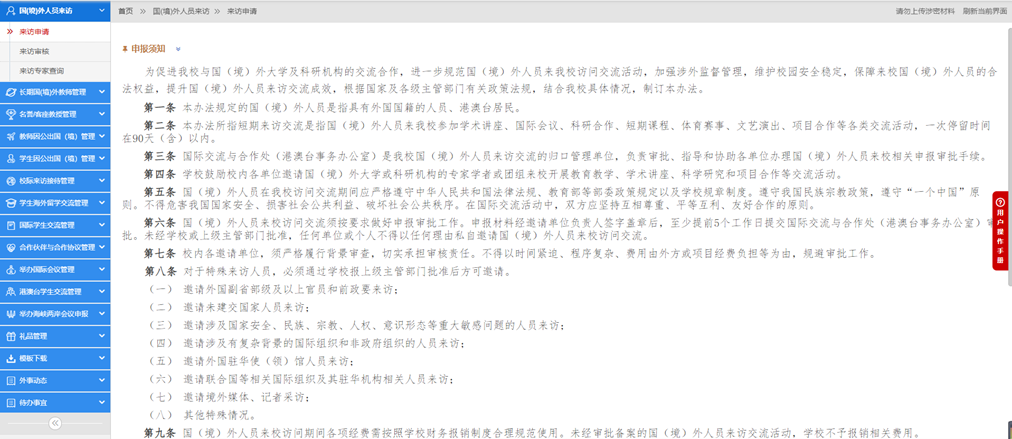 首先阅读申报须知,然后点击下方的开始填报,按填写步骤依次填写各部分必填项,其中,随行家属信息、行程列表为非必填项,来访人员信息请按照实际来访专家/外宾填写,经费信息请参照标准填写,附件信息页面包括专家的相关附件以及本次来访的附件;所有来访信息填写完成并确认无误后,点击完成并提交审核按钮来提交申请。