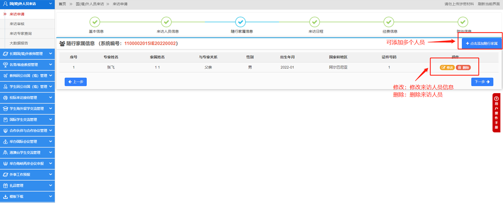 随行家属页面,点击右上角的“点击添加随行家属”弹出家属信息添加页面,标有红色星号的为必填项。