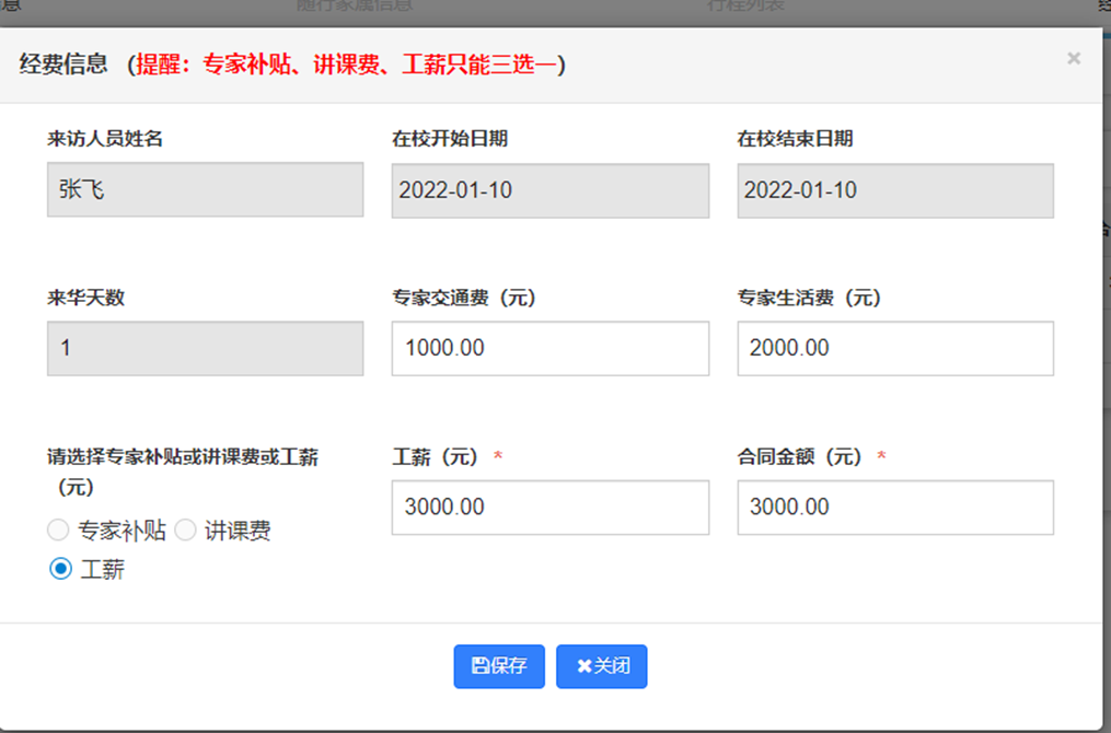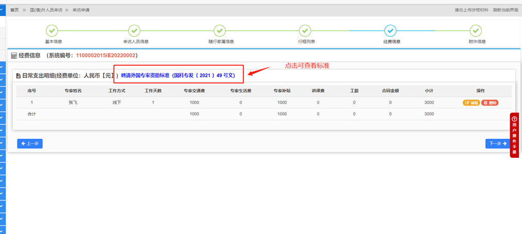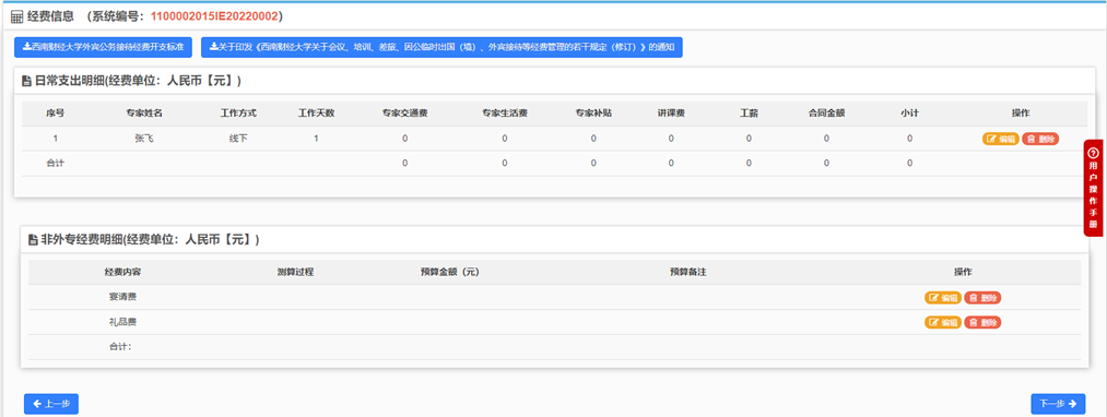 经费信息页面,根据前面选择的经费来源判断显示那一种填写方式,分为外专经费填写页面和外事接待经费填写页面。