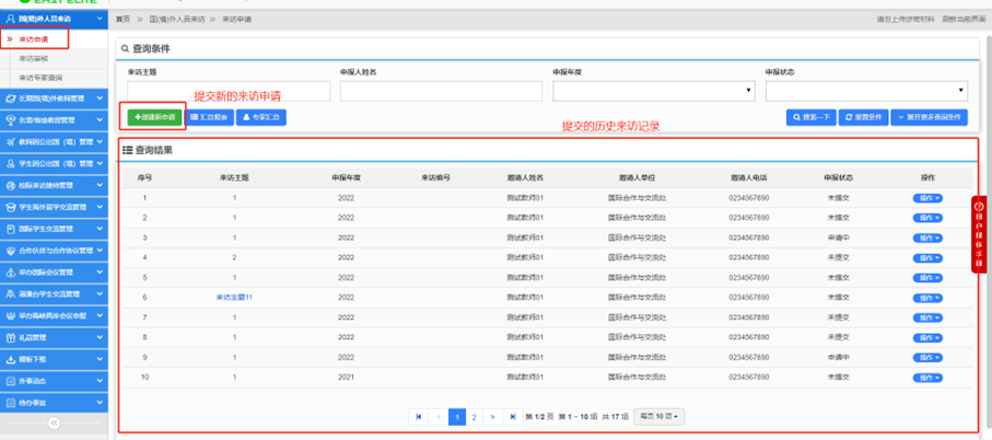 点击进入来访申请页面,此页面可以查看历史申请记录,点击创建新申请来提交新的来访申请;