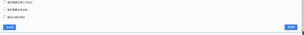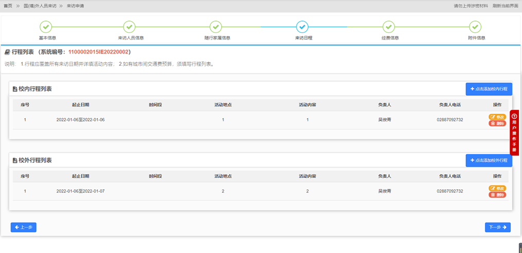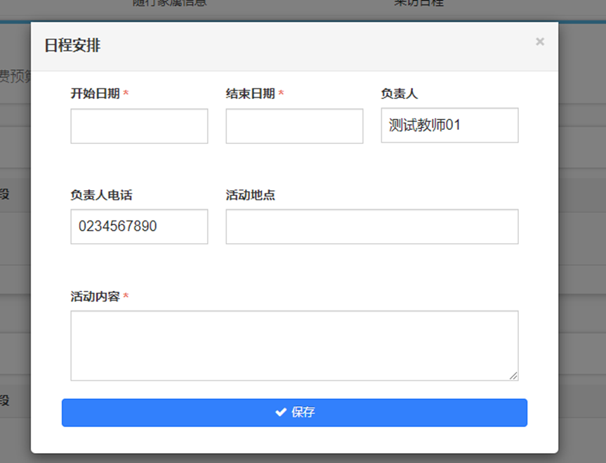 来访日程页面,点击右上角的“点击添加校内行程”、“点击添加校外行程”弹出行程信息添加页面,标有红色星号的为必填项。