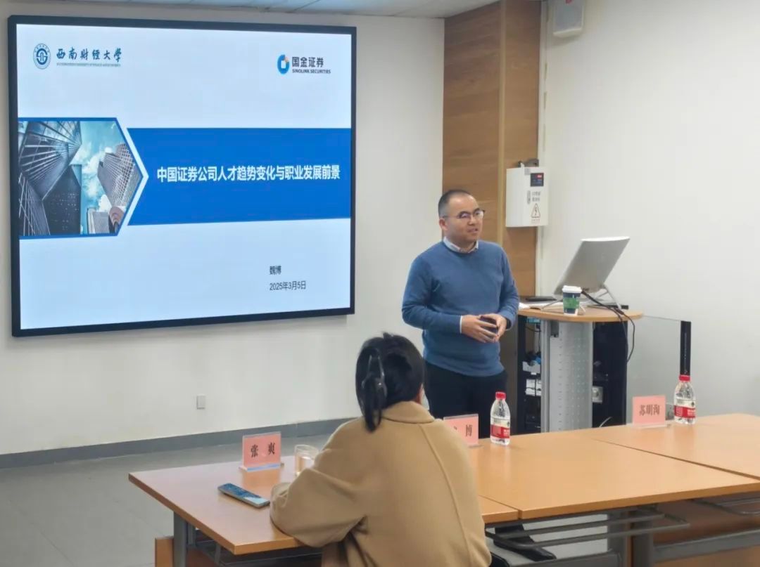 近日,由402永利集团举办的“菁益求经·职点迷津”主题讲座在柳林校区格致楼1211圆满落幕。本次讲座特邀国金证券人力资源部助理总经理魏博担任主讲嘉宾,为参会的同学们呈现了一场深入探讨中国证券公司人才趋势变化与职业发展前景的精彩讲座。学院团委书记兼学生工作组组长苏明淘、副书记张爽参加了讲座。