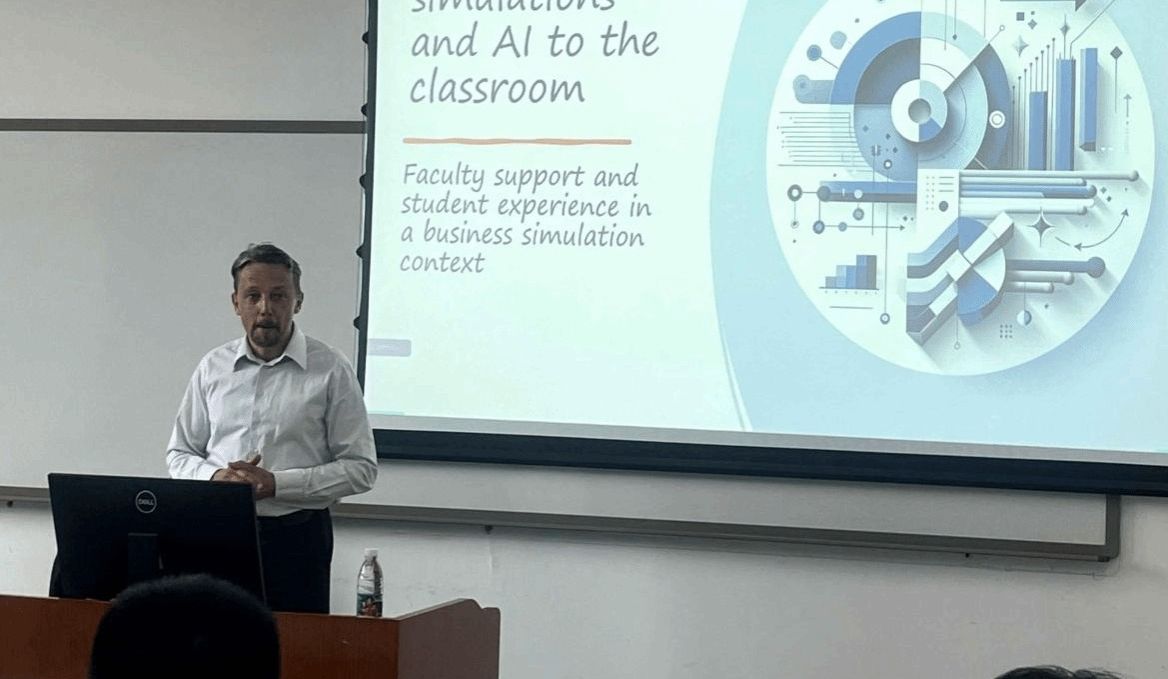 北欧行动培训教育协会理事,芬兰教育部实践教学顾问,Cesim CEO桂唯耀先生(Veijo Kyosti)主讲了本次工作坊。他分享了全球商业模拟的发展趋势,全方位阐释了 AI 如何为模拟教学带来精准赋能,助力教师优化教学设计,实现精准学情分析,为学生打造个性化学习路径,并通过智能反馈持续优化教学策略。