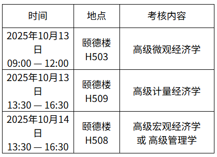 资格考核方式为笔试考试,考核内容为高级微观经济学、高级计量经济学、高级宏观经济学(经济类)或高级管理学(管理类)。