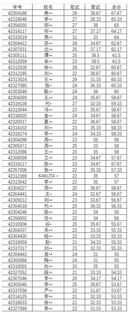 根据“经管国际化创新实验班”选拔方案相关程序,现有以下同学通过笔试及面试的选拔,公示名单公示附后(注:本次考试笔试满分40分,面试满分40分,综合成绩满分80分)。公示时间为9月28日及10月7日、8日(即9月28日起的三个工作日)。
