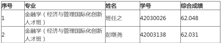 经学院推免工作小组研究决定,学院党政联席会议同意,按照学院已经公布的综合成绩及排名,依次递补金融学(经济与管理国际化创新人才班)专业班任之(学号:42030026),彭继尧(学号:42003138),获得推荐免试研究生资格。