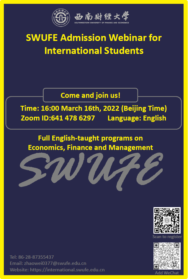 Southwestern University of Finance and Economics 2022 Admissions Webinar will be launched on March 16th.