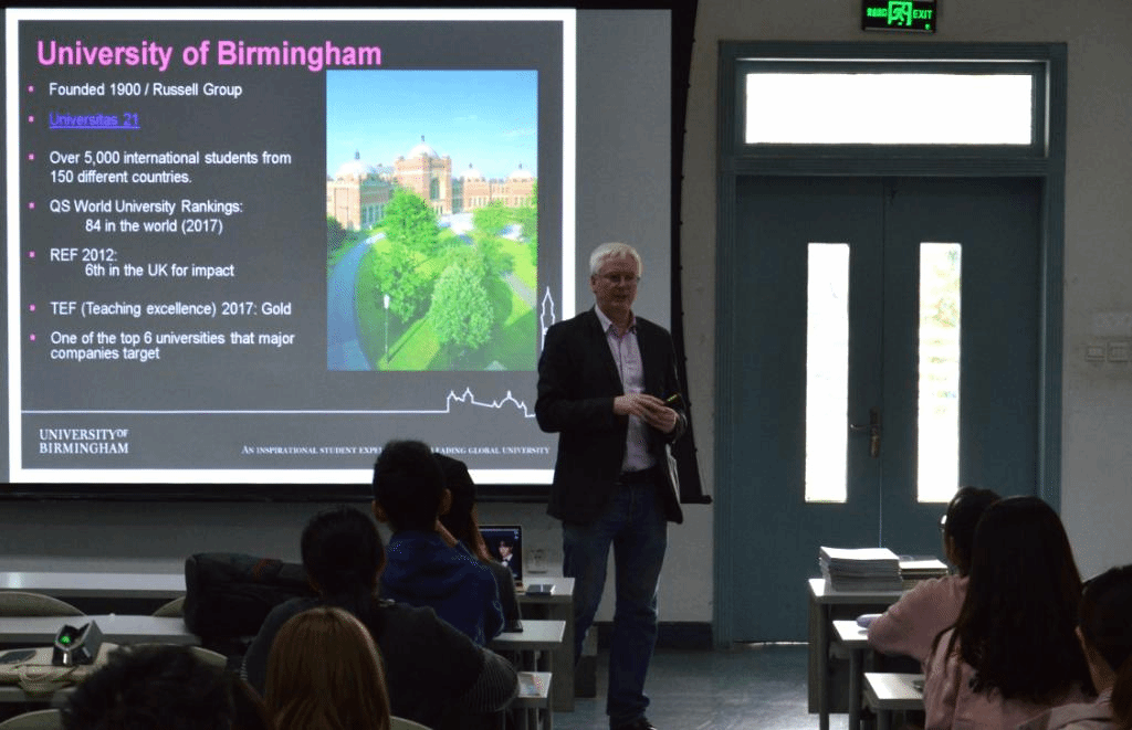 2019年10月29日周二下午,英国伯明翰大学本硕项目宣讲会在柳林校区经世楼F104教室成功举办。宣讲会邀请到英国伯明翰大学商学院本硕项目负责人Mr. Horsewood主讲。Mr. Horsewood为大家介绍了英国伯明翰大学在英国的悠久历史和各类排名,列出了可供大家选择的本科2+2专业和硕士项目专业,之后详细的介绍了伯明翰大学的学分制和具体的课程安排,为大家介绍了英国几种不同的教学方式。最后,Mr. Horsewood为大家介绍了伯明翰大学环境优美的校园与周边情况。