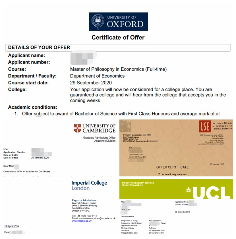本届毕业学员共获得了下列全球知名大学录取通知书:英国牛津大学1封,英国剑桥大学1封,英国伦敦政治经济学院(LSE)11封,英国伦敦大学学院(UCL)8封,英国帝国理工大学(IC)2封,英国伦敦国王学院(KCL)2封,英国华威大学6封,美国哥伦比亚大学1封,等等。